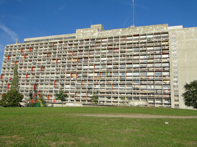 Attention, une question pour les connaisseurs : quels grands principes du Corbu retrouvent-t-on ici ? Facile, il y a (en désordre) les pilotis, les façades libre, du béton brut, le toit terrasse, des rues intérieures, une orientation selon la courbe du soleil et des plans basés sur le Modulor. Placé en hauteur et composé de 17 étages, l’immeuble marque le paysage. Les pilotis libèrent le rez-de-chaussée et permettent la vue sur la nature. A l’intérieur, des jeux de lumière et de couleur rythme les parcours quotidiens des habitants. En tout, il y a 414 cellules d’habitation.
